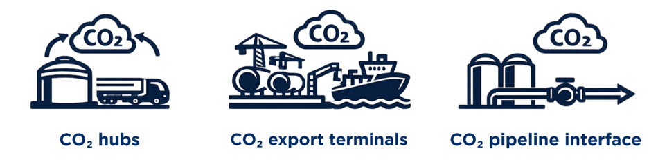 Alongside capture technologies, the transport and storage of captured CO₂ are becoming essential parts of the emerging CCS ecosystem. Terminals, hubs and storage facilities must handle large volumes of liquefied CO₂ safely and efficiently, creating new requirements for the equipment used in these systems. Typical applications include CO₂ hubs, ship loading terminals, truck unloading stations and transfer to pipelines or intermediate storage.